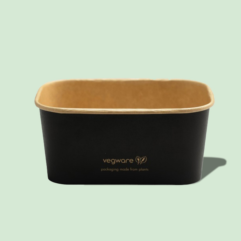 1000 ml-es, téglalap alakú, fekete kraft papírból készült ételtároló. Thai ételekhez, sült csirkéhez, utcai ételekhez tökéletes választás. Kraft kartonból készült, vízbázisú béléssel. Díjnyertes Vegware minőség. Ipari komposztálásra tervezve, újrahasznosítható anyagokból készült.